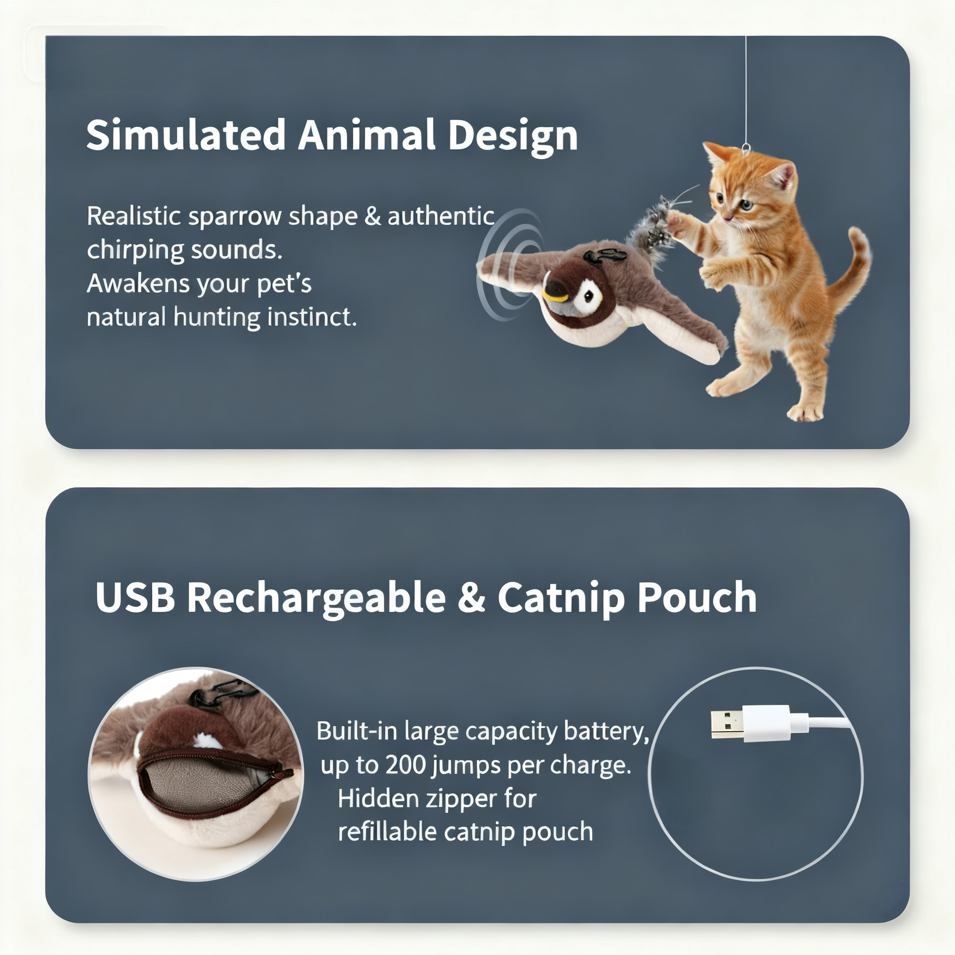 Included Components: Interactive Bird Toy x 1 、Micro USB Charging Cable x 1、Refillable Catnip Pouch x 1