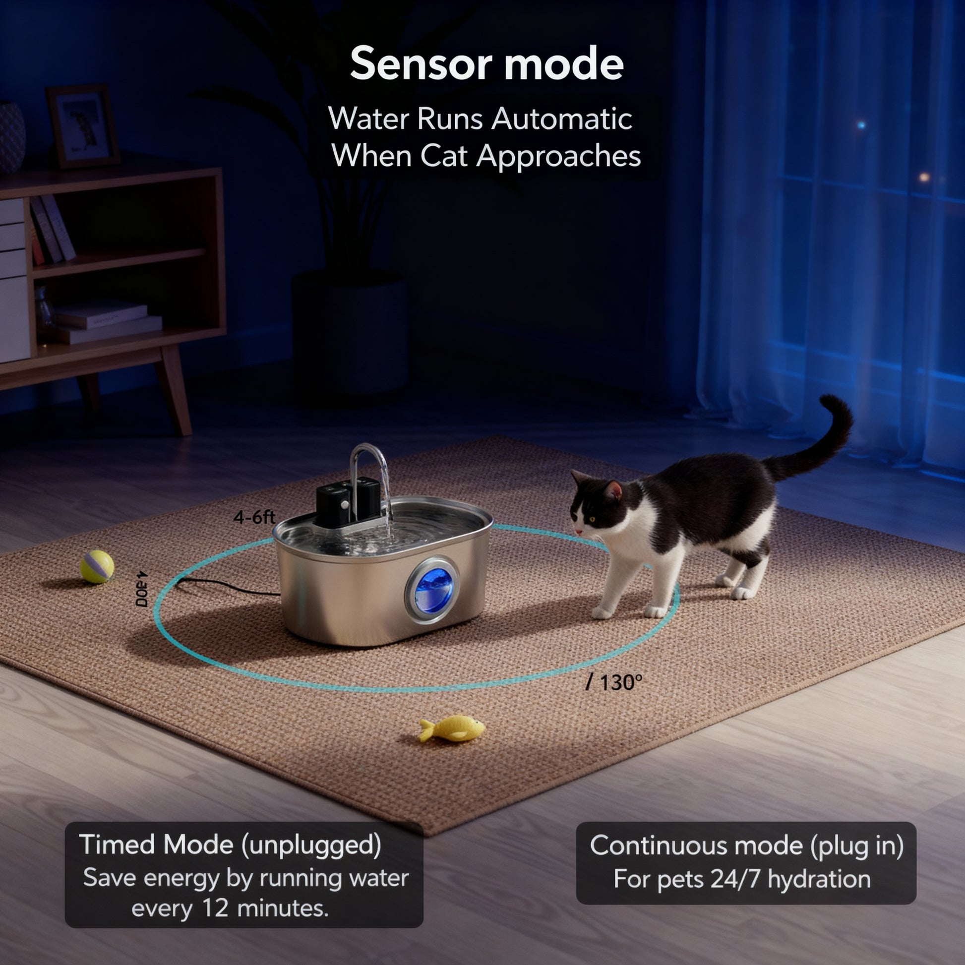 - Continuous Mode — Provides 24/7 flowing water for multi-pet homes.