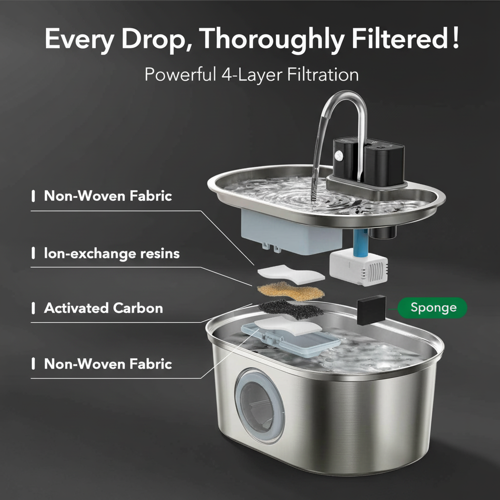 The MEOWDERN™ features a 4-stage vertical filtration system that removes impurities, softens water, and enriches it with oxygen—keeping it fresh, in motion, and irresistible to your cat.