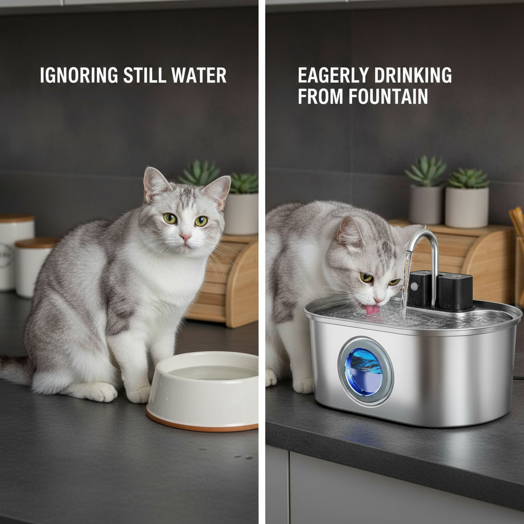 Still water quickly gathers dust, hair, and odors. Most cats instinctively avoid stagnant bowls, leading to dehydration and urinary issues over time.